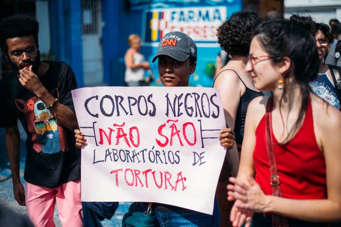 Muitos manifestantes levavam cartazes e faixas com referências à escravidão de africanos e descendentes no Brasil.